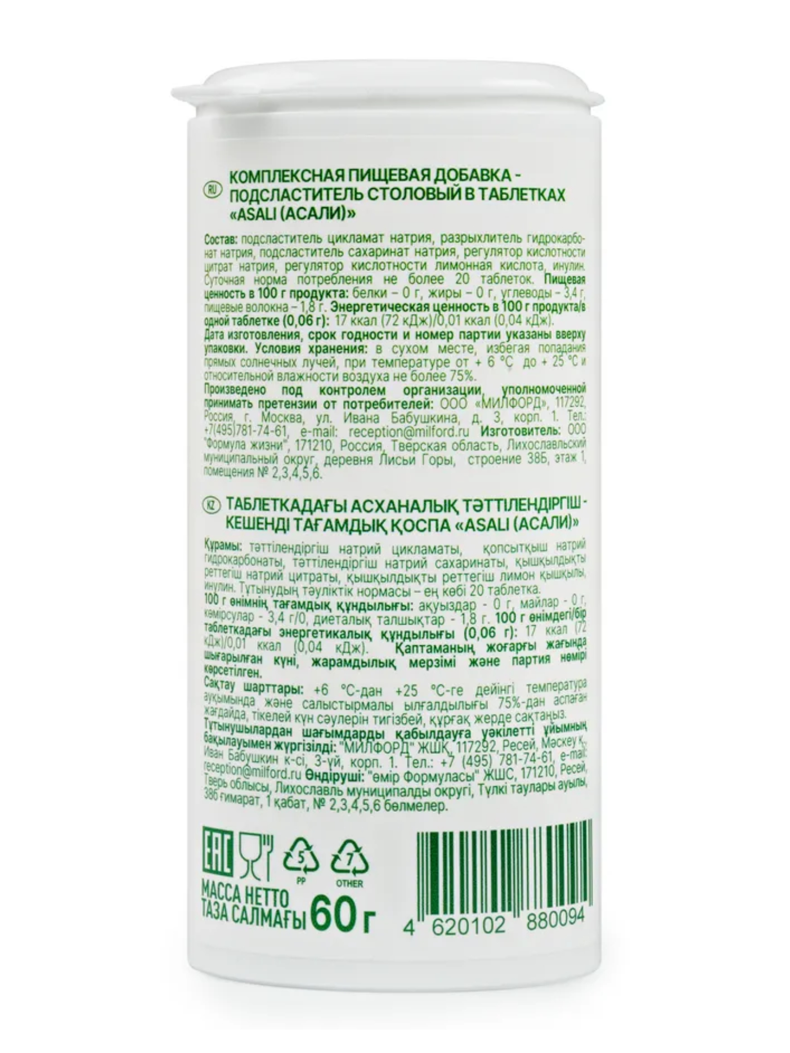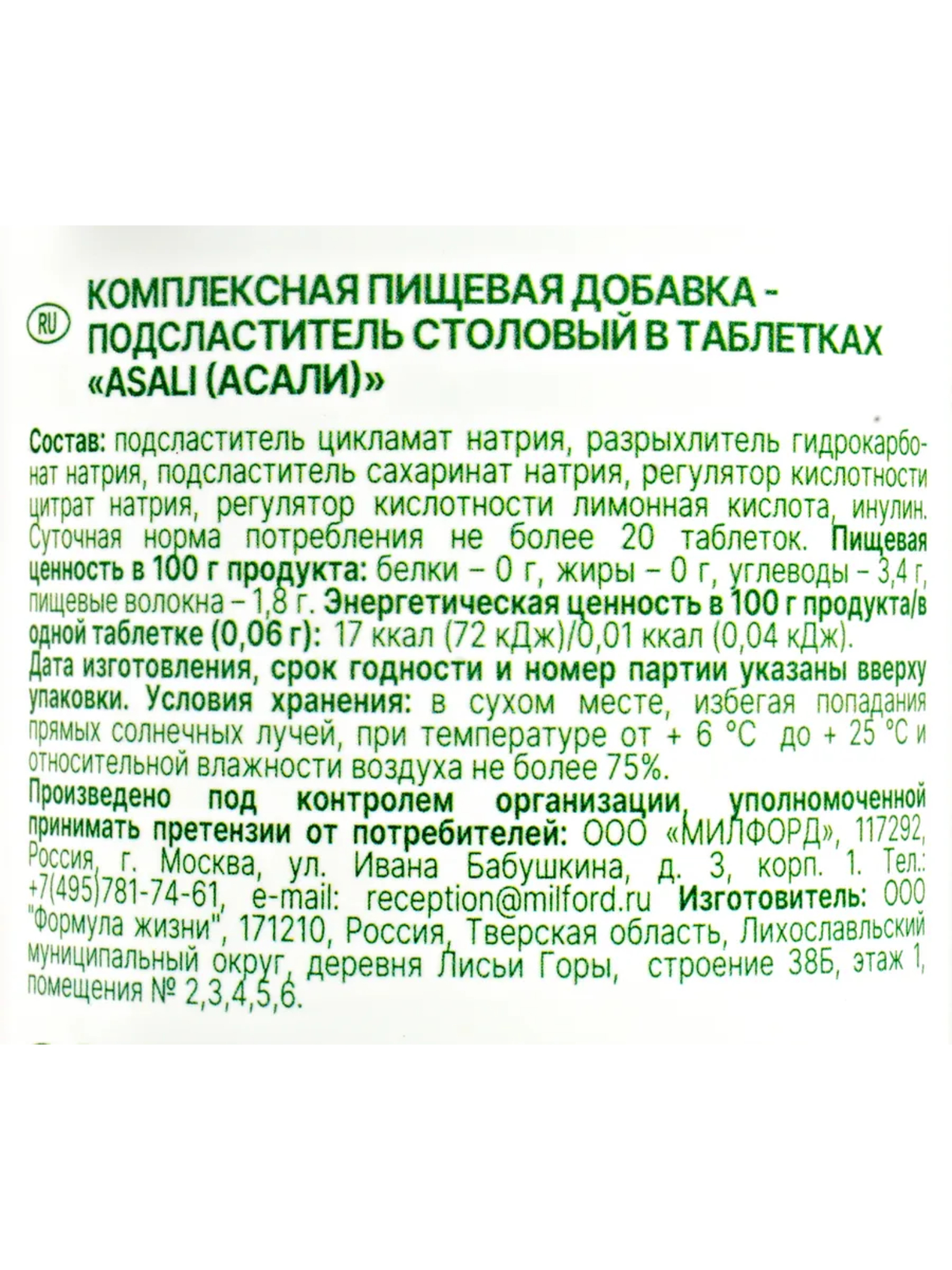 Сахарозаменитель Milford Asali 1000 таблеток