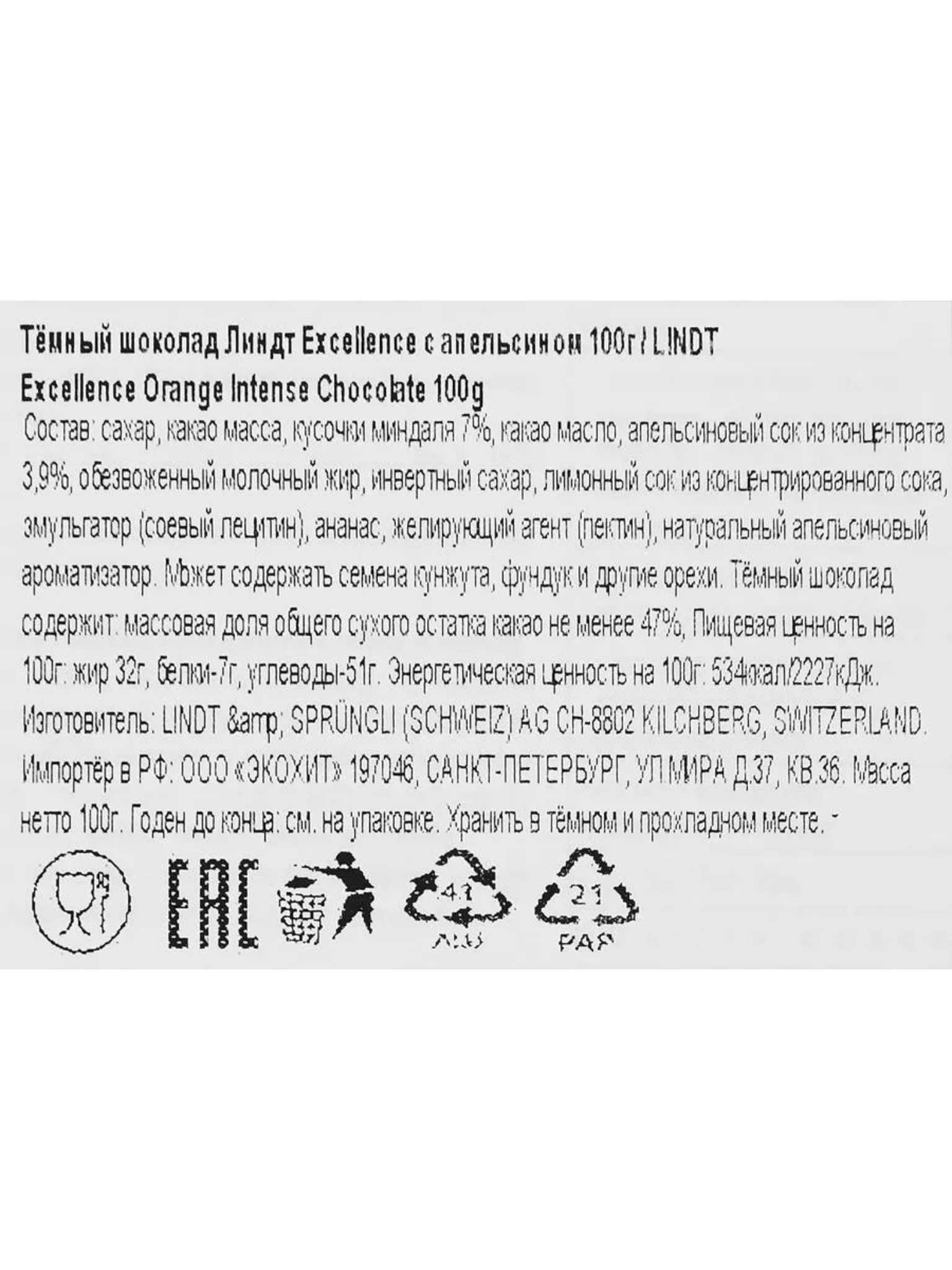 Тёмный шоколад Lindt с апельсином и миндалем 100 г