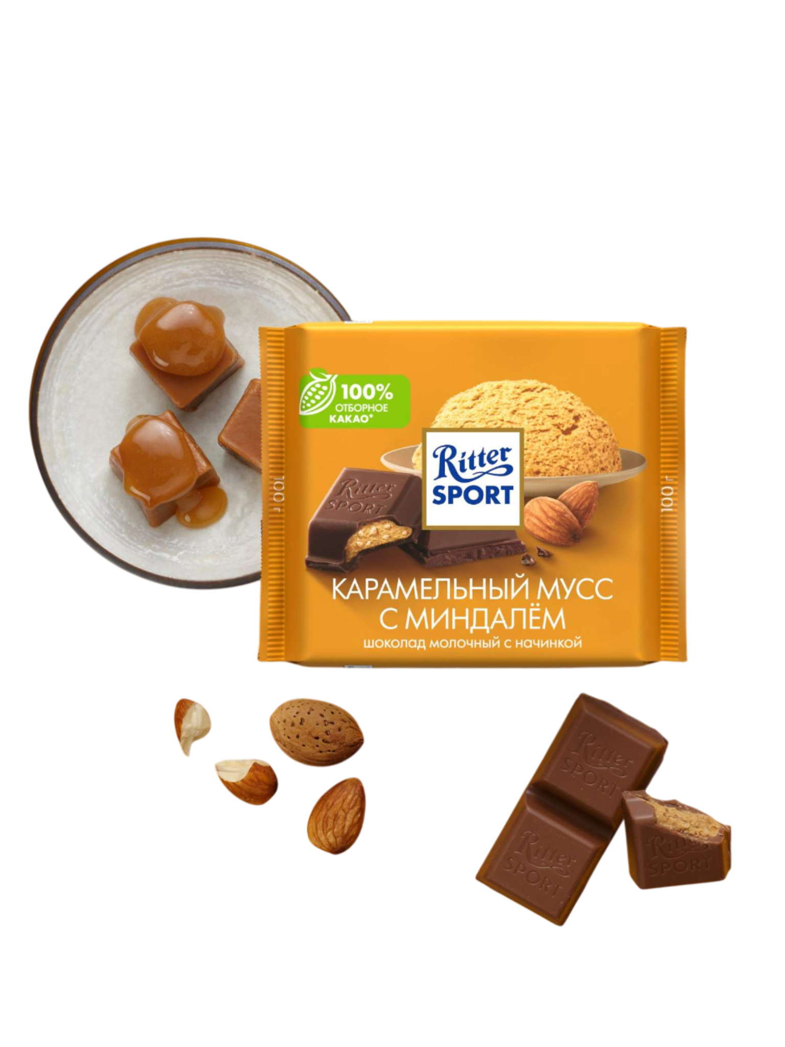 Шоколад Риттер Спорт Карамельный мусс с миндалем молочный с карамельной начинкой и кусочками солёного миндаля.