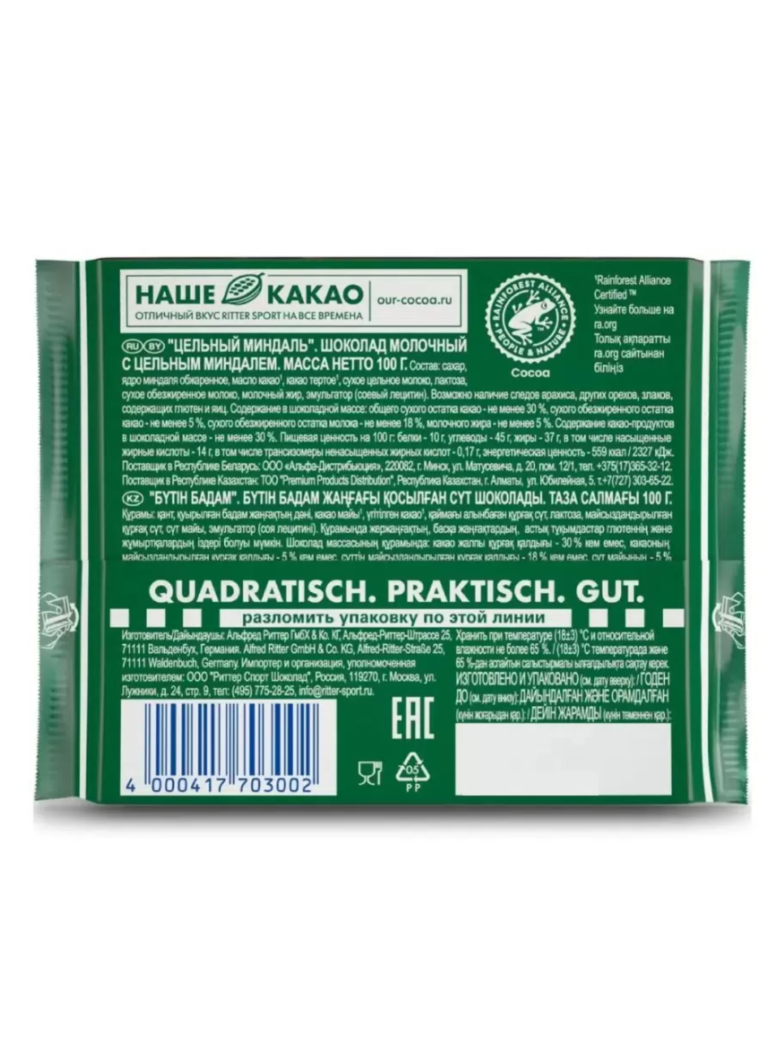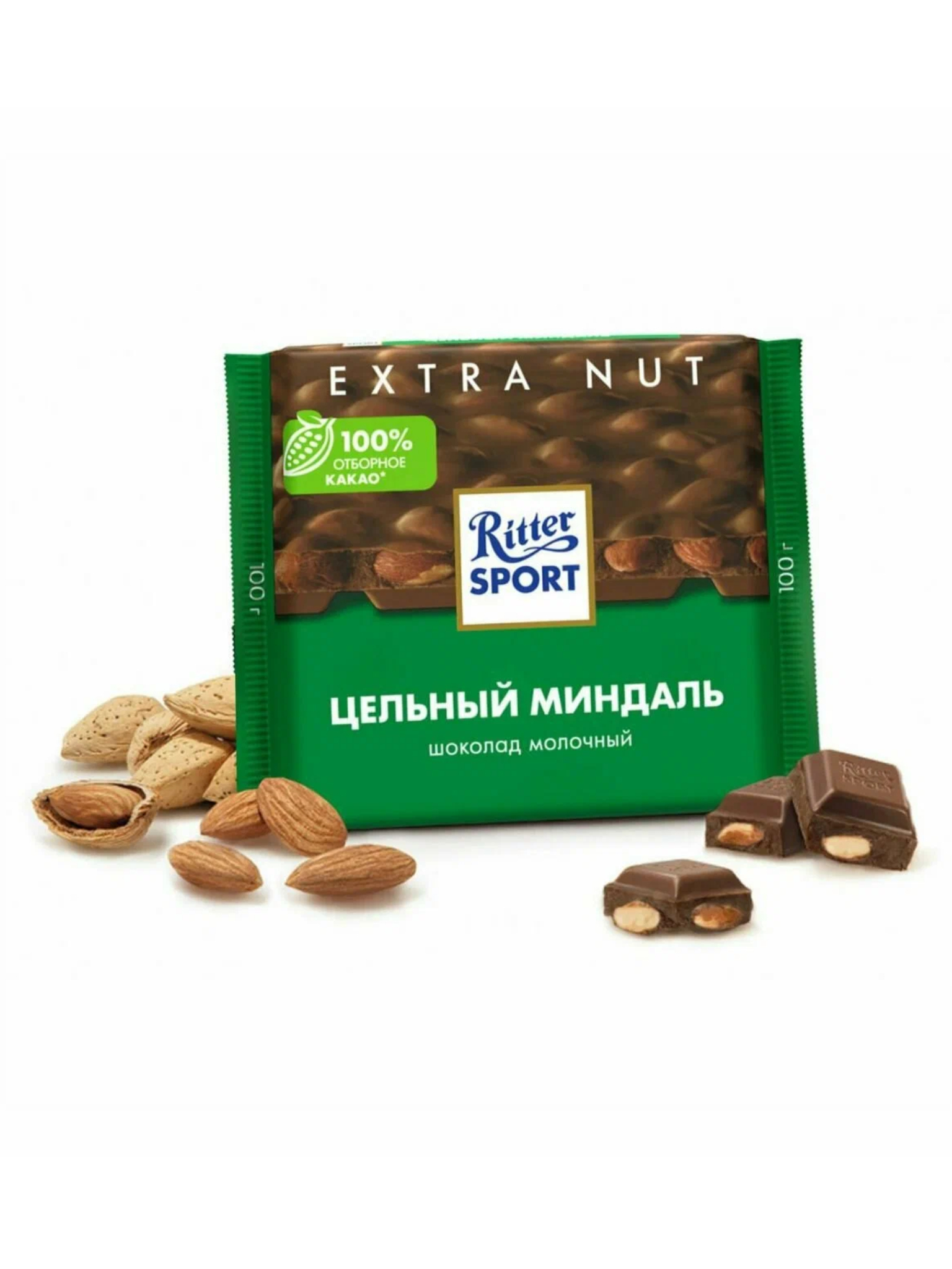 Шоколад молочный Ritter Sport Цельный миндаль, 100 г – насыщенный молочный шоколад с щедрой добавкой целых обжаренных миндальных орехов.