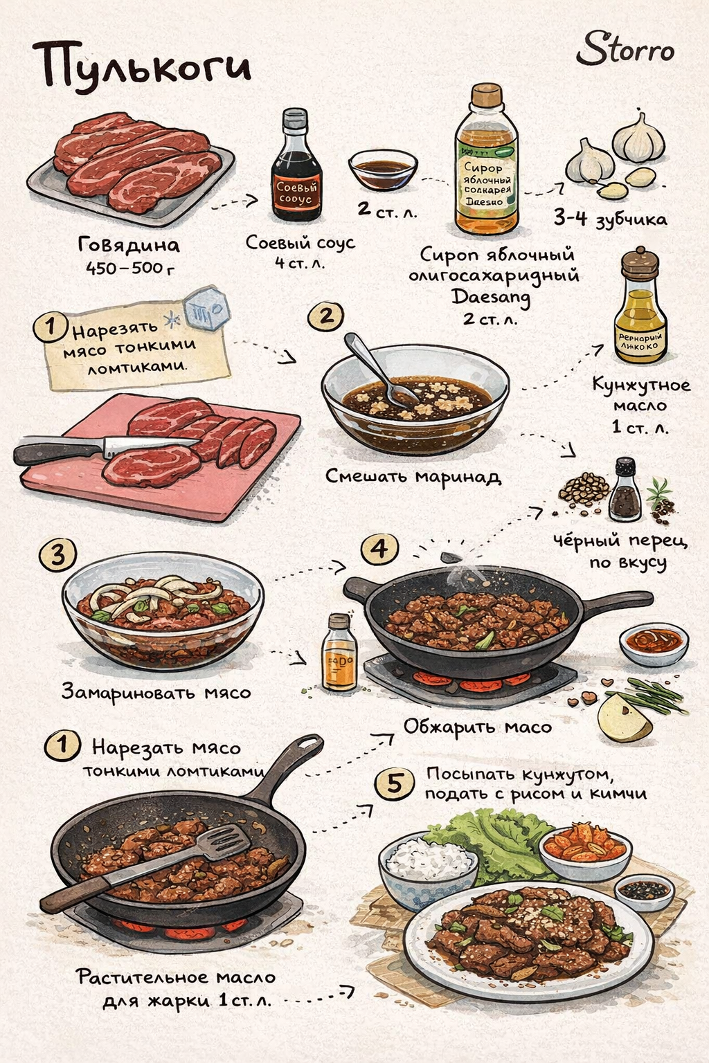Рецепт блюда с использованием Сироп яблочный олигосахаридный Daesang: Пулькоги (корейская маринованная говядина) — одно из самых популярных блюд корейской кухни. Это тонко нарезанная говядина в сладко-солёном соусе, которую быстро обжаривают до карамельной глазури. Яблочный сироп здесь отлично заменяет часть сахара и подчёркивает фруктовые ноты, делая вкус мягче и глубже 🍎🥩