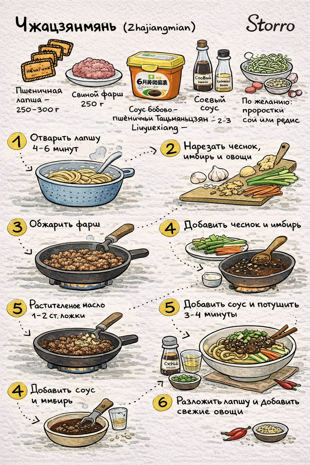 Перед подачей лапшу тщательно перемешивают с соусом, чтобы она полностью пропиталась насыщенным вкусом. Чжацзянмянь подают горячим — это простое и очень популярное блюдо китайской кухни, которое отлично подходит для сытного обеда или ужина. 🥢🍜