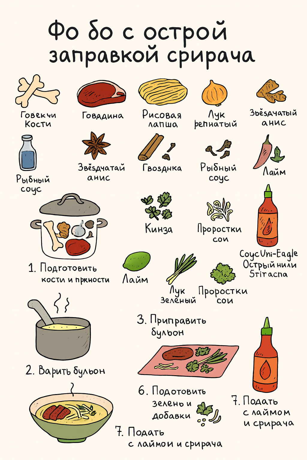 Влейте в миски очень горячий бульон – он должен сразу «сварить» тонкую говядину. Подайте фо бо с дольками лайма и бутылочкой Соуса Uni-Eagle Острый чили Sriracha: каждый добавляет соус и сок лайма по вкусу, добиваясь идеального баланса остроты и свежести. Приятного аппетита! 😋