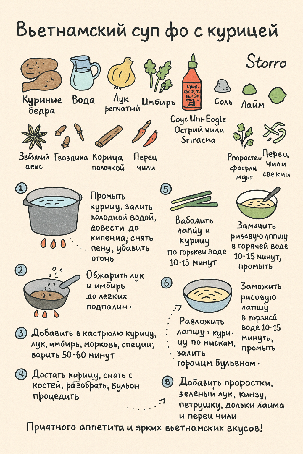 Приготовим вьетнамский суп фо с курицей — ароматный, лёгкий, но очень насыщенный вкусом бульон, который традиционно подают с рисовой лапшой и свежей зеленью. Острый соус Uni-Eagle Sriracha добавит знакомой классике приятную пикантность, подчёркнет вкус специй и сделает суп более «живым». Такое блюдо подойдёт и для семейного обеда, и для уютного ужина, когда хочется чего-то пряного и согревающего 😋