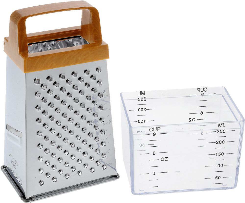 Четырехгранная терка, выполненная из высококачественной нержавеющей стали с зеркальной полировкой и эргономичной цветной пластиковой ручкой, станет незаменимым атрибутом приготовления пищи. На одном изделии представлены четыре вида терок - крупная, мелкая, фигурная и нарезка ломтиками. Кроме того, в комплекте с теркой идет пластиковый контейнер, что дает дополнительное удобство при ее эксплуатации. Современный стильный дизайн позволит терке занять достойное место на Вашей кухне и прекрасно впишется в любой кухонный интерьер. Подходит для мытья в посудомоечной машине.