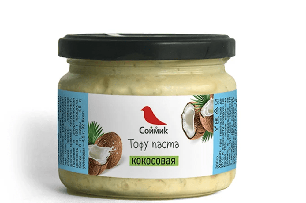 Это на 100% веганский продукт, не содержащий следов животного происхождения. Основа – это бобы сои, которые славятся своей пользой и огромным содержанием растительного белка. Тофу-паста рекомендуется для вегетарианцев, людей ведущих здоровый образ жизни, сидящих на диете и соблюдающих пост. Полезна она спортсменам для придания и восстановления сил. В составе отсутствуют эмульгаторы и загустители, поэтому паста естественно отслаивается. Способ приготовления: Тофу-закуска уже полностью готова к употреблению в пищу. Её можно есть просто так, делать бутерброды и канапе, использовать в качестве начинки к блинчикам и пр. Состав: Соевые бобы, вода, свертывающее вещество (хлористый кальций), масло подсолнечное рафинированное, соль, сахар, кокосовая стружка, пектин, лимонная кислота, крахмал кукурузный.