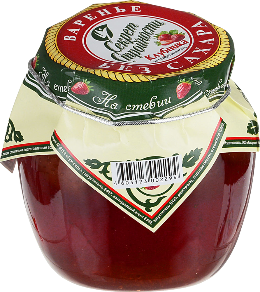 Состав: ягоды, низкоосахаренная патока, загуститель пектин, подсластитель стевиозид, специально подготовленная вода.
