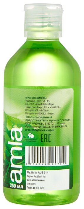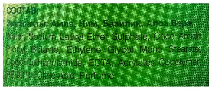 - Экстракты амлы, нима, тулси, алое вера, вода, sodium lauryl ether sulphate, coco amido prpyl betaine, ethylene glycol mono stearate, coco diethanolamide, EDTA, acrylles copolymer, PE 9010, лимонная кислота, отдушка.