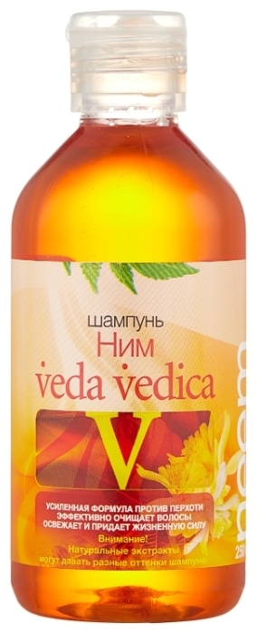 Шампунь Веда Ведика с нимом против перхоти— аюрведическая формула, содержащая целебные травы, действие которых направлено на оздоровление волос и кожи головы. Индийский шампунь Ним рекомендуется для ухода за любым типом волос, особенно для жирных волос и для тонких, ломких волос. Кроме экстракта Нима, в состав индийского шампуня против перхоти входят экстракты брингараджа («Король волос»), тулси (базилик священный), экстракт зеленого чая, амлы (индийского крыжовника), алое вера, индийская хна, мыльный орех. Таким образом шампунь Ним работает как шампунь от перхоти и от выпадения волос, поскольку экстракты брингараджа, хны, амлы и нима эффективно способствуют оживлению и укреплению волосяных луковиц, повышают плотность и укрепляют структуру волосяного ствола.